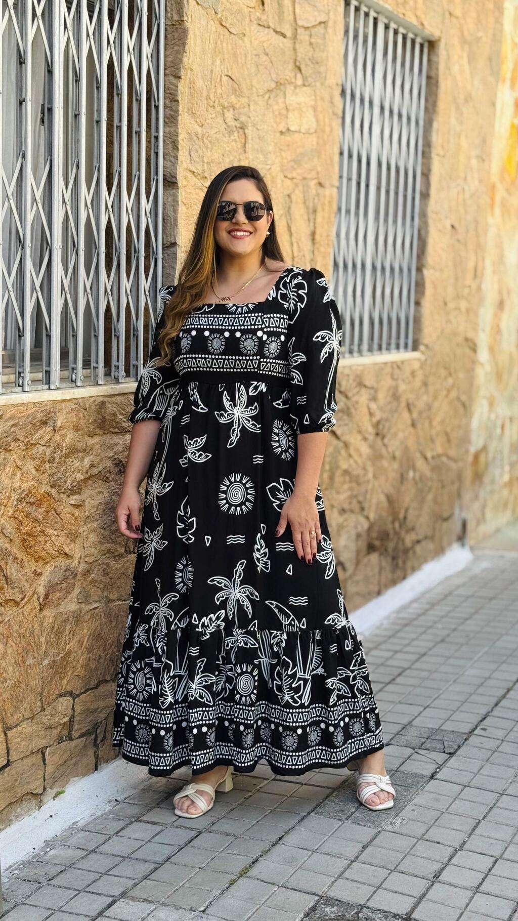 Vestido longo, estampado, com duas variações de cores, com manga 3/4 e elástico , possibilitando o uso da manga mais compridinha ou mais curtinho, possui elástico nas costas, decote em desenho quadrado! Tamanho único, veste do 36 ao 44!