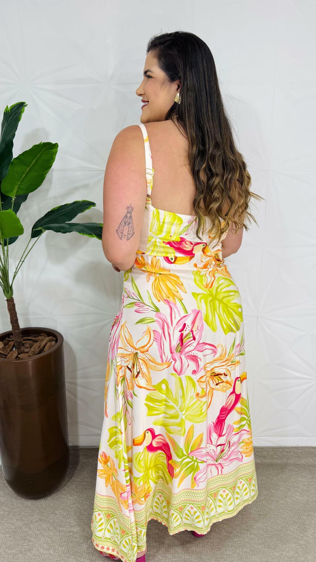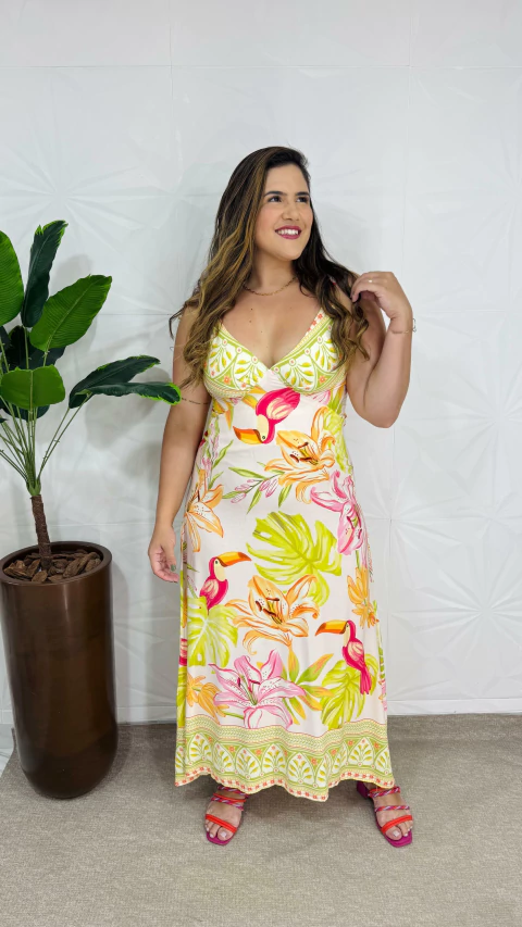 Com uma estampa vibrante e cheia de cores alegres, este vestido é perfeito para quem quer trazer leveza e estilo para os dias quentes.